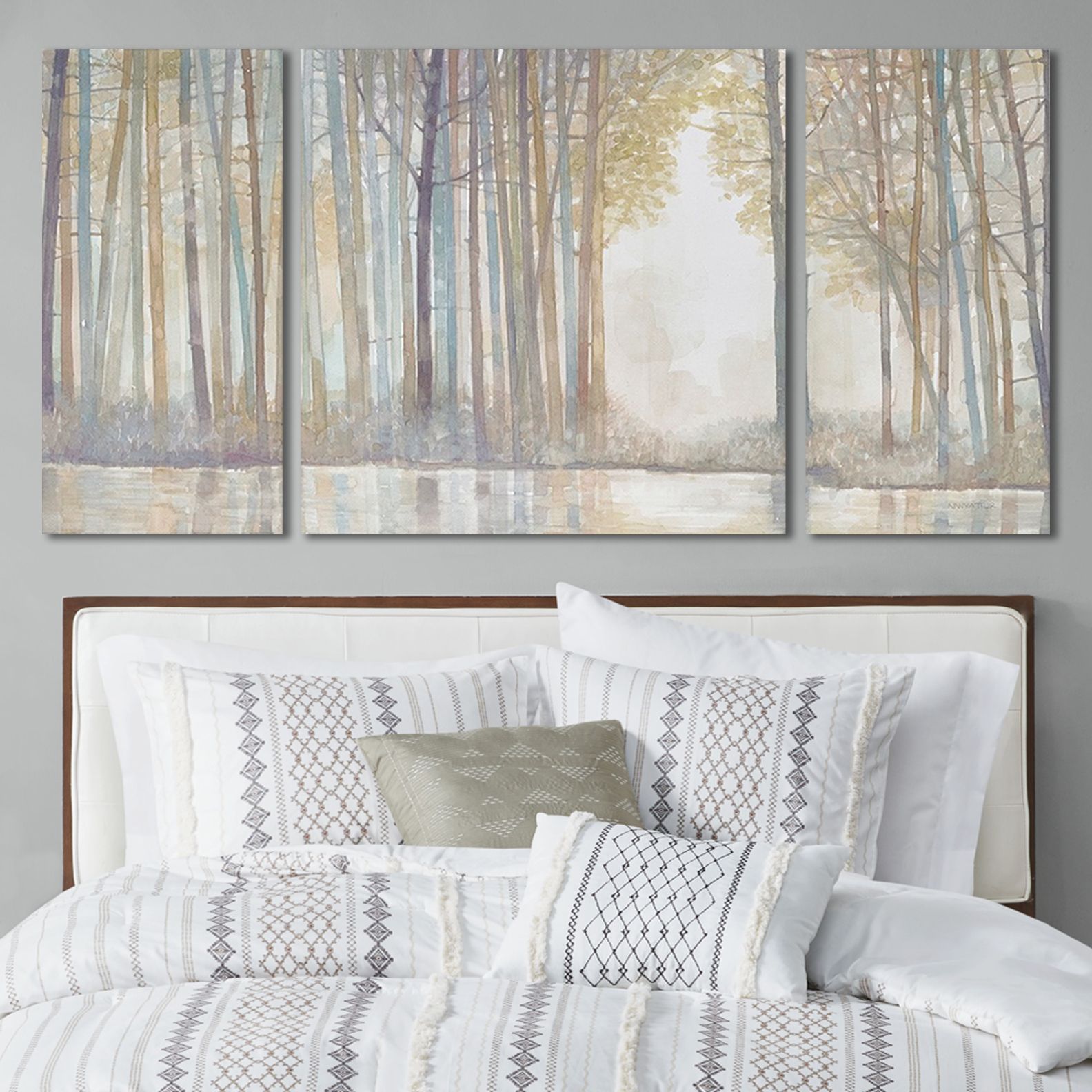 Triptych canvas wall decor set with a serene forest landscape in calm neutral colors