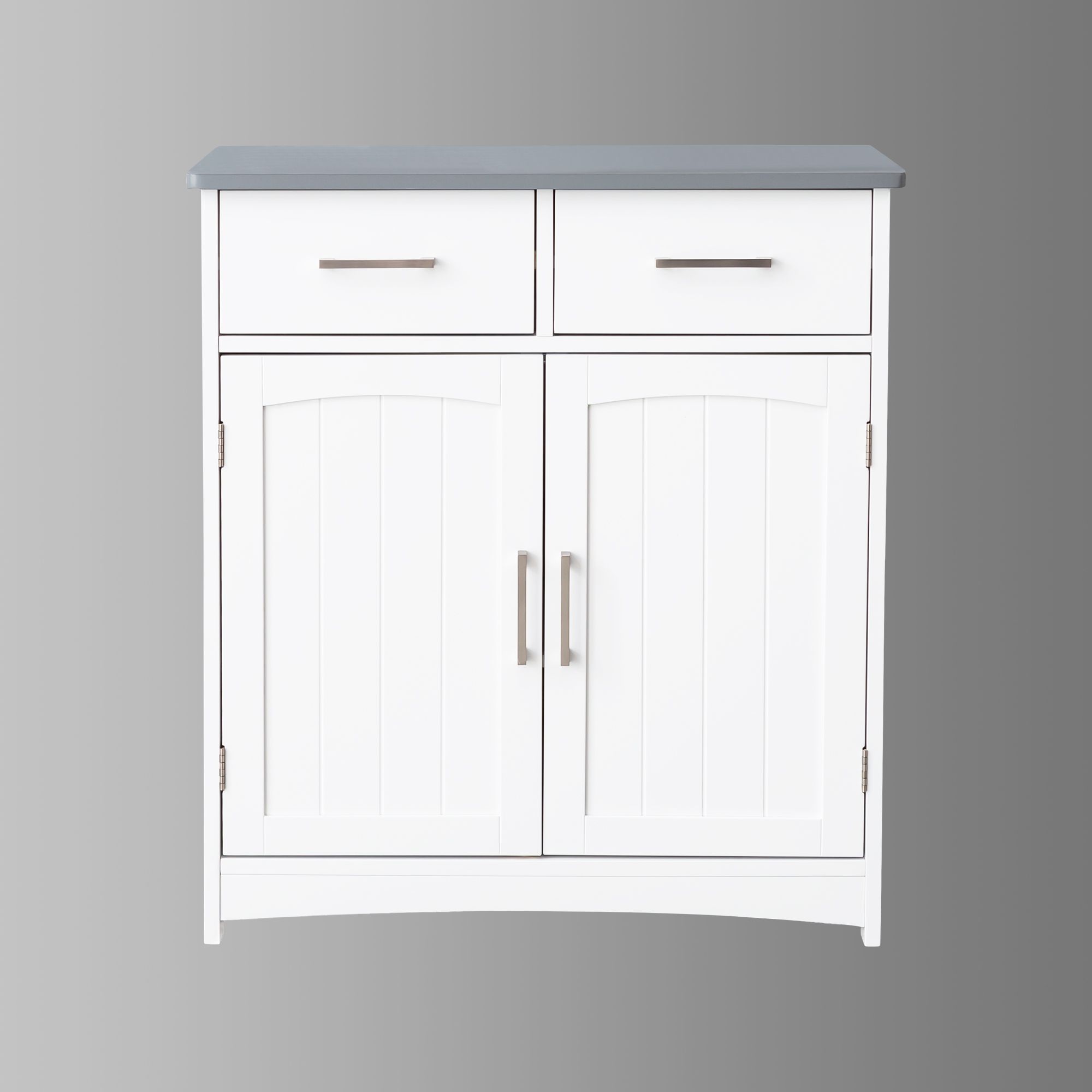 This buffet cabinet with storage features a grey top plate and a matte white finish, perfect for any home. The drawers and doors have double-hole metal handles for easy access, while the wooden guide rails with an anti-drop design ensure smooth drawer operation. The door includes an inner arc design and three pull cords for added convenience. Inside, a movable shelf with three-speed adjustment offers flexible storage. Two anti-dumping holes with iron hooks secure the cabinet, and the 180-degree full-open hinges, door stopper, and suction make the doors easy to use. Ideal as a coffee bar or sideboard buffet cabinet.