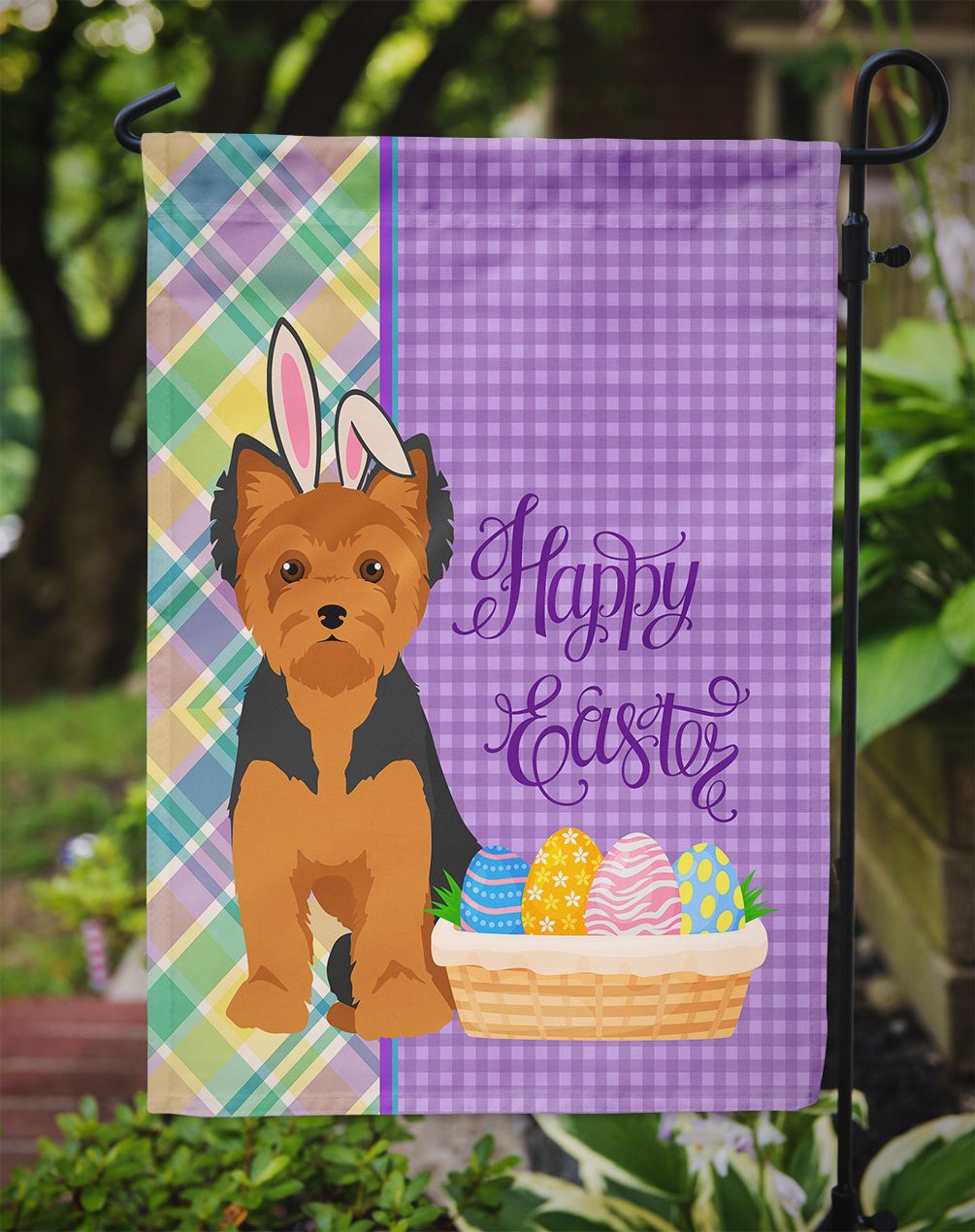 Garden Flag featuring breed specific Yorkshire Terrier artwork. Celebrate Easter with this Easter Garden Flag. This Garden Flag is from Caroline's Treasures collection Easter Egg Hunt. Enhance the beauty of your garden, patio, or yard with Caroline's Treasures Decorative Garden Flag, proudly made in the USA. Crafted from two pieces of thick, double-sided polyester fabric, this 2-ply garden flag is designed to withstand various weather conditions, making it water-resistant and weatherproof. Featuring correctly readable words on both sides, this garden flag offers a delightful visual experience from any angle. With its heavier weight, it stands out among other garden flags, ensuring stability and durability even in wind, rain, and snow. Measuring approximately 11 1/4 inches by 15 1/2 inches, this flag allows you to personalize your outdoor decor. It comes with a 1 1/2-inch sleeve sewn in, allowing easy attachment to any standard garden flag stand or garden size porch hanger (sold separately). Make a statement in your outdoor space with Caroline's Treasures Decorative Garden Flag, a vibrant and high-quality flag that adds color and personality to your surroundings. Proudly made in the USA, it's a symbol of quality craftsmanship and attention to detail. This Garden Flag is from Caroline's Treasures Dogs category of products.