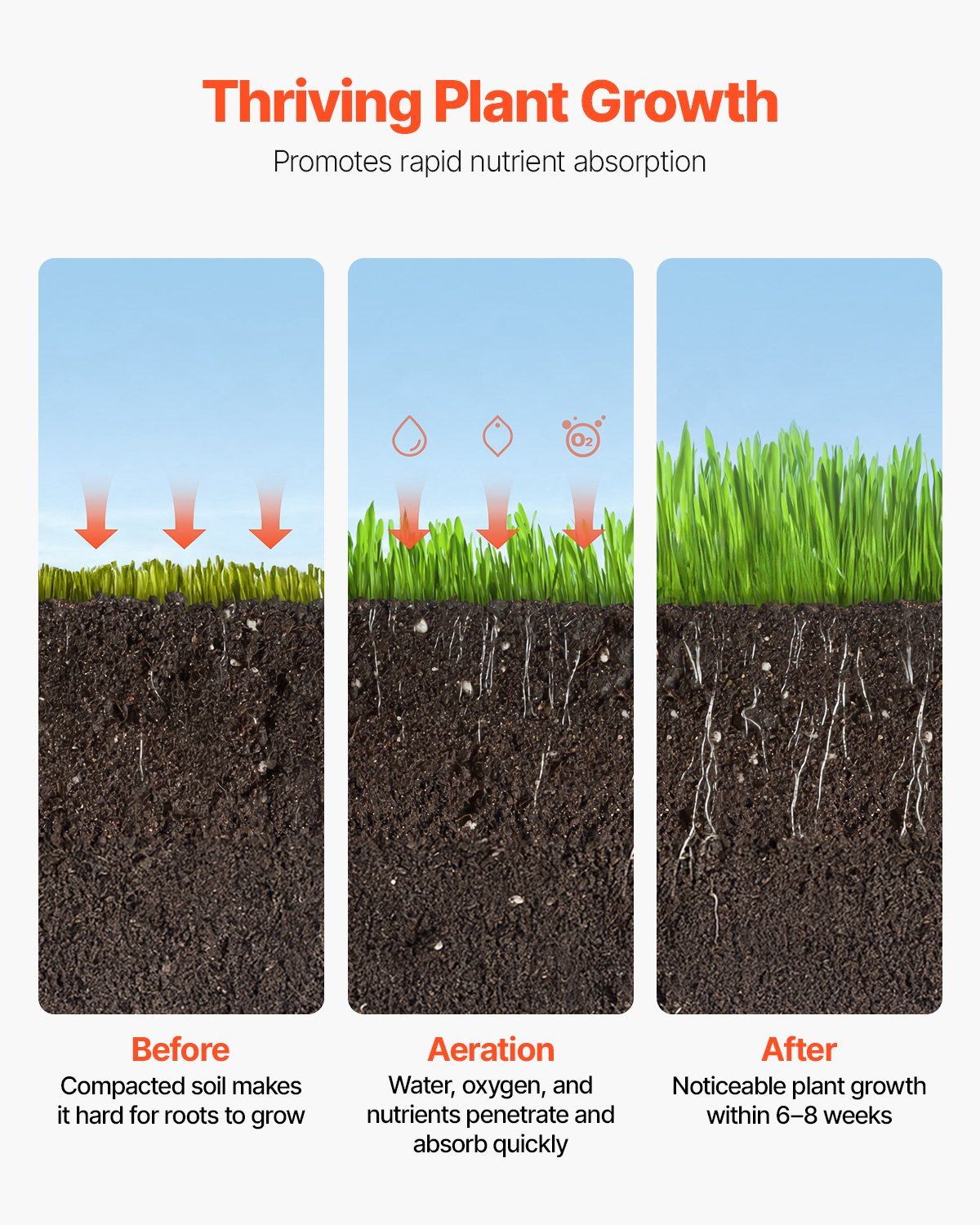 2.Promotes Plant Growth: This manual rolling aerator lawn improves soil structure by creating holes that deliver more water and oxygen to plants, avoiding yellowing or decay caused by oxygen and water deficiency. Within 6-8 weeks, you'll see noticeable growth in your plants.