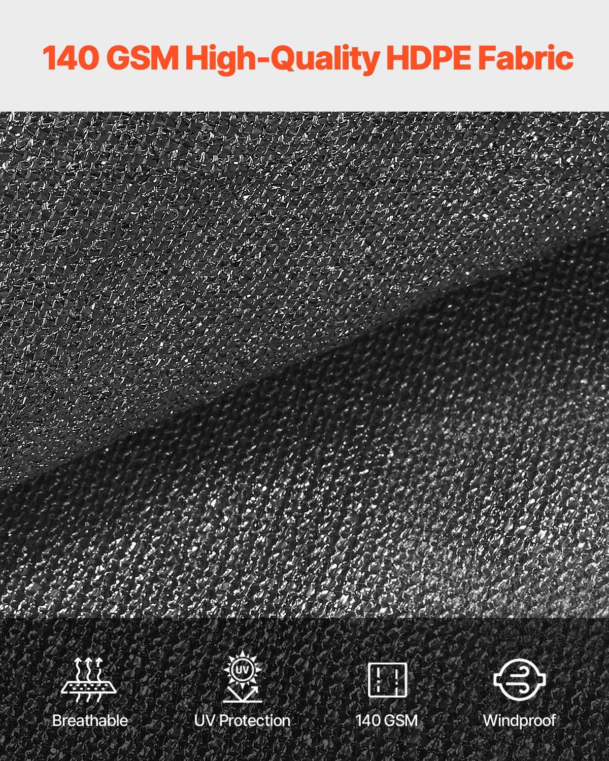 The 140 GSM high-density HDPE fabric is tear-resistant, waterproof, and breathable. It blocks sunshine for lasting shade and comfort. With stainless steel grommets, 30 zip ties, 5 elastic balls, and 4 nylon ropes, it allows flexible installation for sunshade and privacy.