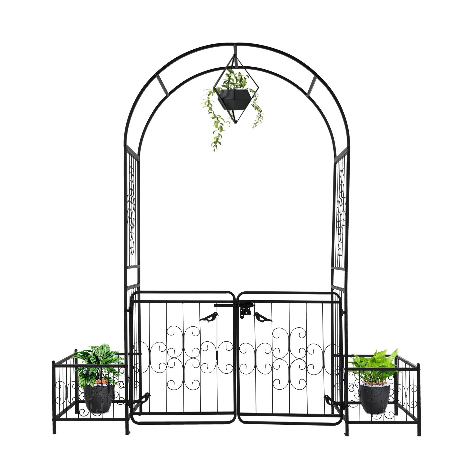 Add a touch of elegance and structure to your outdoor space with this 7.2FT Black Metal Garden Arbor with Arched Top Gate and Planter Boxes—a perfect blend of style, function, and floral beauty. Whether you're framing a garden path, setting up a romantic wedding arch, or creating a dramatic entryway, this iron arbor delivers timeless appeal.